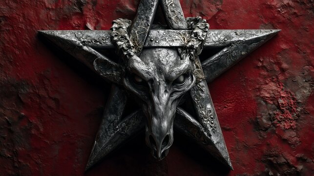 A metallic pentagram with a goat’s head at its center stands out against a dark red background. The image evokes mystery, esoteric rituals, and gothic symbolism.