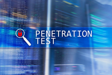 Penetration test. Cybersecurity and data protection. Hacker attack prevention. Futuristic server room on background.