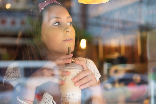 Happy Hispanic South American woman drinking Asian boba milk tea