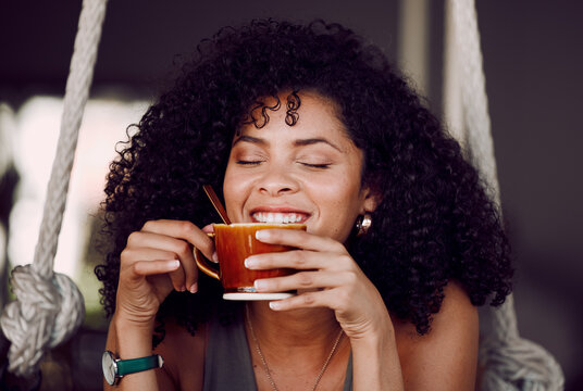 Smiling woman enjoying relaxing tea moment in elegant spa