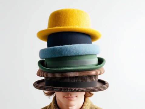 A humorous scene of someone wearing too many hats, playful and exaggerated