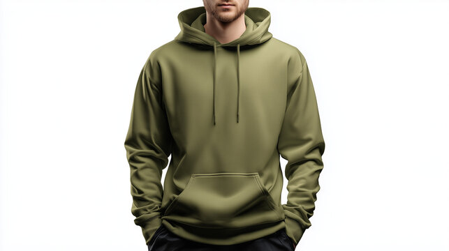 a person wearing an olive green hoodie, front view mockup with hands in pockets, white background,