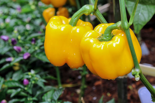 Fresh Yellow bell pepper hanging on tree with water drop in blur background, vegetable, plant, garden.