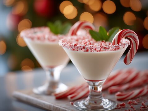 Delicious white chocolate martini garnished with crushed candy canes against blurred Christmas lights background. Two elegant white chocolate martinis adorned with crushed candy canes and mint leaves