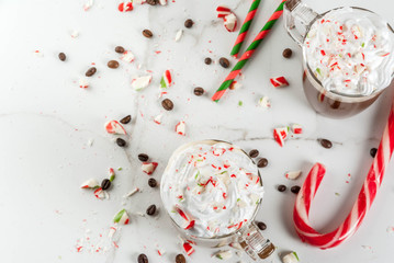 Homemade Peppermint Mocha, Christmas coffee drink with candy canes, whipped cream and mint syrup , on white marble table, copy space