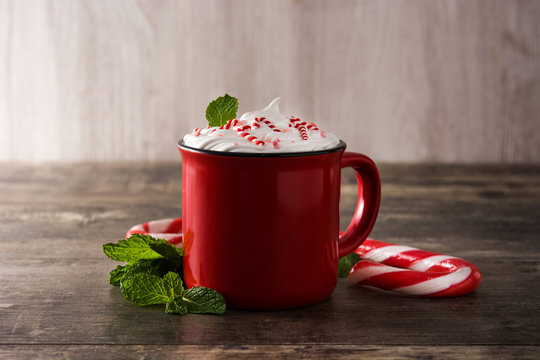 Peppermint coffee mocha decorated with candy canes for Christmas on wooden table.