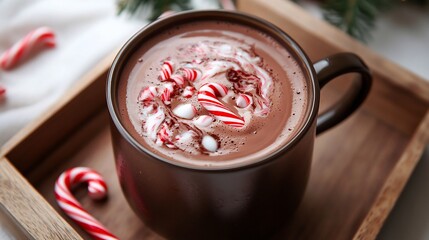 Peppermint candy canes hot chocolate A festive mug of cocoa with candy canes melting into the drink creating swirls of red and white