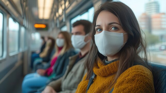 Masked commuters on urban train, silent acknowledgment of public health vigilance and pandemic memories