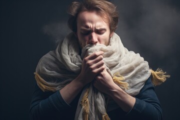 Sick man sneezes into a paper napkin or handkarchief on dark background. New outbreak of the coronavirus pandemic. Covid pandemic in 2024 2025 pirola strain and omicron disease concept