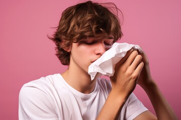 Sick teenage boy sneezes into a paper napkin on pink background. New outbreak of the coronavirus pandemic. Covid pandemic in 2024 2025 pirola strain and omicron disease concept