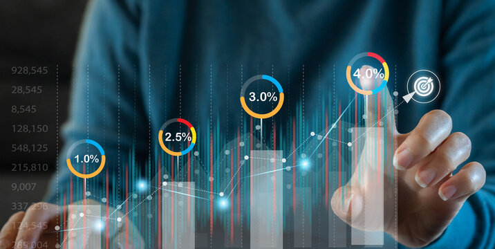 Human hand with business financial investment data graph, business growth, money, stock market, chart, interest rate, investment, funds, percent commission, banking, marketing, profit, target