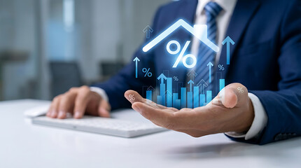 Real estate market concept with businessman hand showing holographic house and rising percentage arrows representing mortgage rate increase