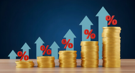 Stacks of golden coins with percentage signs illustrate financial growth and investment returns against a blue background with upward arrows representing success and increasing profits