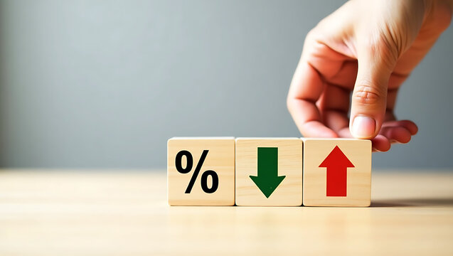 Hand adjusting wooden cubes with percentage down and up arrows