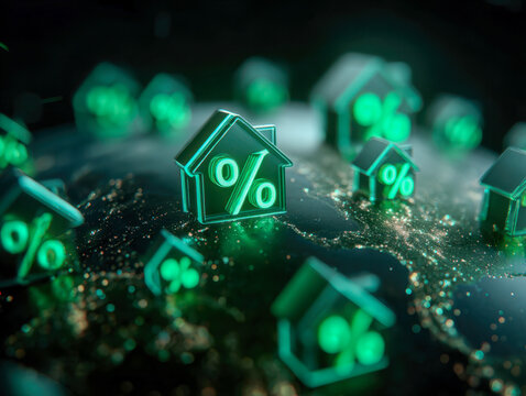 Close-up of a hand holding a pen over financial documents with a laptop and calculator in the background, overlaid with percentage signs. Concept interest rate calculations and economic analysis.