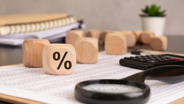 Wooden cube showing the percent symbol on financial documents, with a magnifying glass, calculator, and a potted plant.