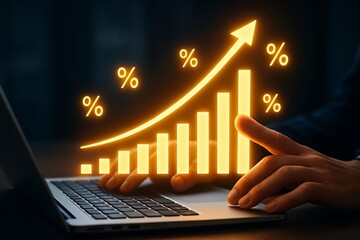A laptop displays a glowing graph with an upward trending arrow and percentage signs