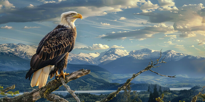A majestic bald eagle is perched on a tree branch overlooking a serene lake. The eagles powerful stature is emphasized against the backdrop of the peaceful waters.