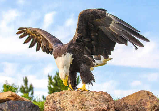 bald eagle perched on a rock with wings spread