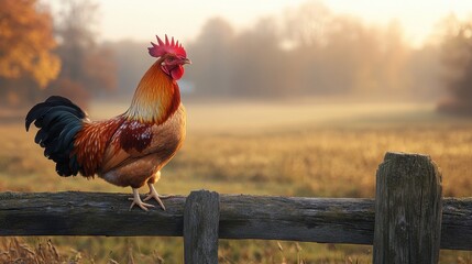 Glossy black bird perching on rustic fence overlooking field