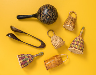 Traditional percussion instruments on yellow background