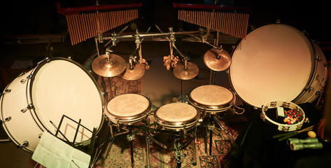 Musical percussion drums instruments on the table in symphonic orchestra. Castanets, Tamburine, maracas, drumsticks.