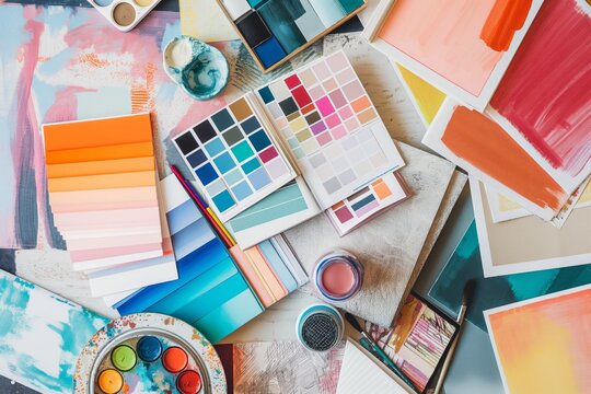 Inspiring flat lay of various color palettes and paint swatches perfect for design projects