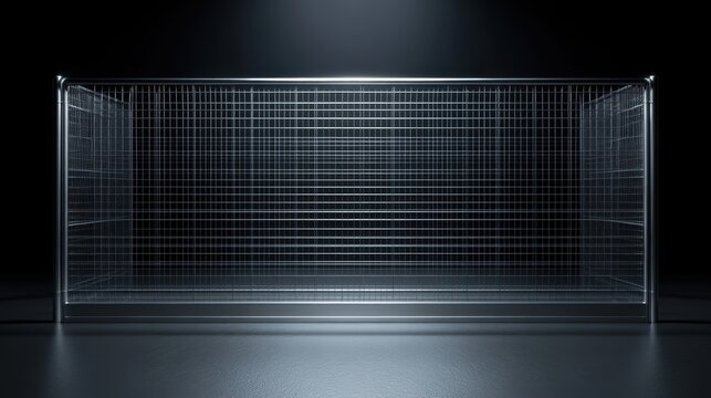 A tightly woven steel mesh fence with a reflective surface creating a geometric pattern against a dark background