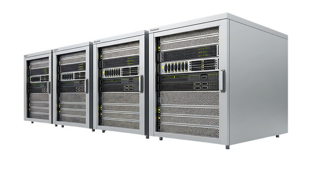 Row of server racks, with illuminated status lights and perforated fronts, isolated on white or transparent background. PNG