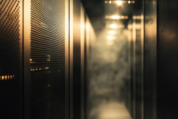 A dimly lit server room with rows of perforated metal cabinets, showcasing technological infrastructure.