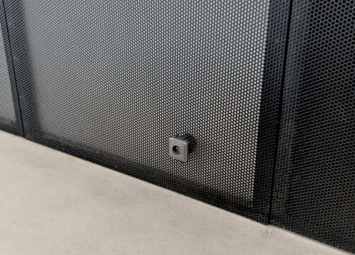 detail of perforated metal panel, part of server cabinet server rack or data cabinet optimal airflow ventilation, protected internal equipment from damage or unauthorized access, wall socket. wall cla