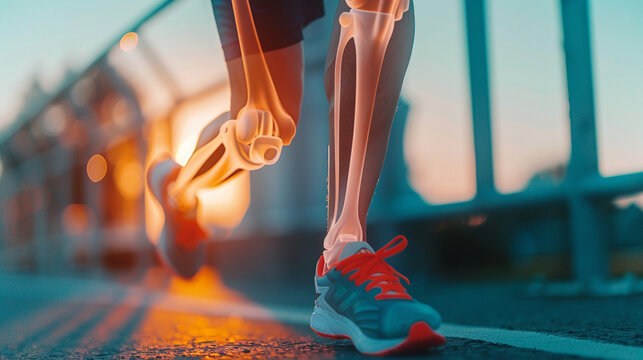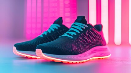 Digital fitness concept with sneakers and neon lights, highlighting high-tech training, endurance, and athletic performance enhancement