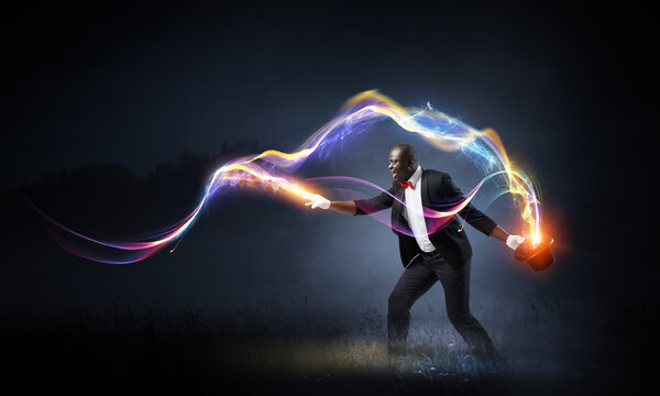 Male illusionist performing tricks . Mixed media
