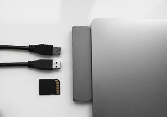 Laptop with USB Type-C adapter with unpluged USB cables. The USB adapter under the Type-C connector for laptop. Multiport station for laptop with multiple different ports. Hub Converter.
