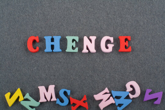 CHENGE word on black board background composed from colorful abc alphabet block wooden letters, copy space for ad text. Learning english concept.