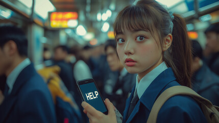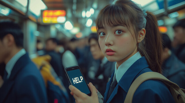 満員電車で助けを求める女子高生