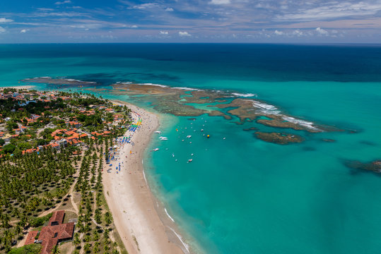 Aerial view of Porto de Galinhas beaches, Pernambuco, Brazil. Natural pools. Fantastic vacation travel. Great beach scene.
