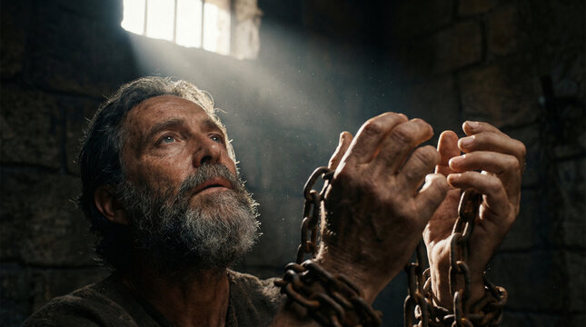 Portrait of Apostle praying in prison cell looking up at divine light with chains on hands.