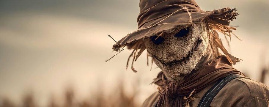 Sinister scarecrow on a haunted cornfield during a Halloween festival