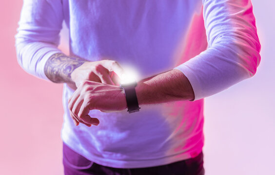 A man with a tattoo adjusts his smartwatch while standing against a vibrant, colorful backdrop. It captures a modern moment of technology integration in daily life during the evening.