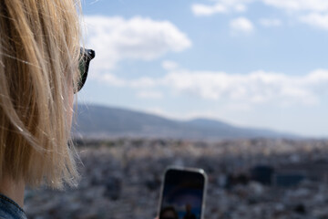 Woman taking photo with smartphone outdoors, tourist capturing city view, blonde female in sunglasses holding phone, travel lifestyle moment.