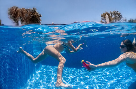 Two friends enjoy swimming pool snorkeling on summer vacation