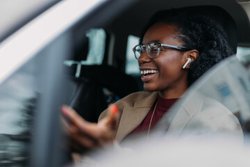 Happy, driving and business woman in car to travel, journey and rent transportation. Smile, driver and person in motor vehicle, automobile and road trip to commute to work in the morning in transport