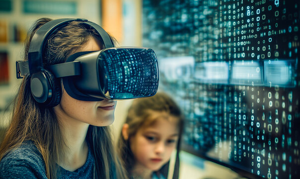 Young girl immersed in a virtual reality experience, exploring digital data streams through VR headset, with another child observing intently in the background.