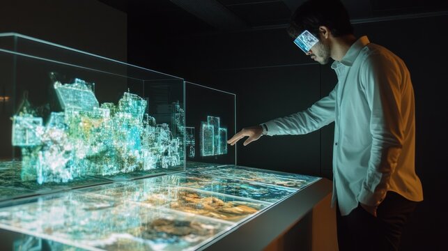 an individual interacts dynamically with a holographic screen, illustrating the fusion of human presence and advanced holographic technology in a captivating interactive experience.
