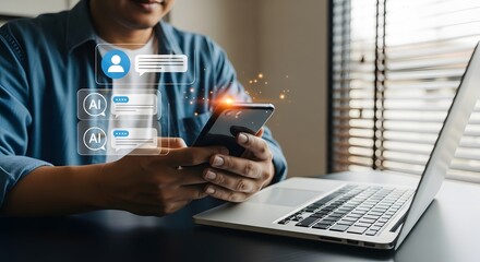 Exploring ai chatbot technology on mobile phone with laptop for business communication online now