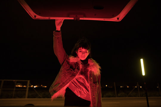Woman exploring trunk in mysterious lights