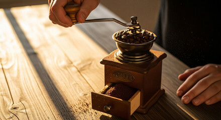 A person's hands are using a vintage coffee grinder, grinding coffee beans on a wooden table.
