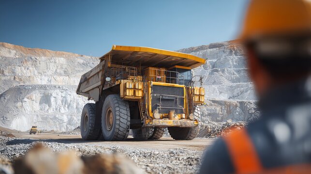 Giant haul truck at an open-pit mine with a worker in the foreground