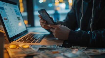 Person using a smartphone while working on a laptop with scattered cash on a table in an urban setting at night